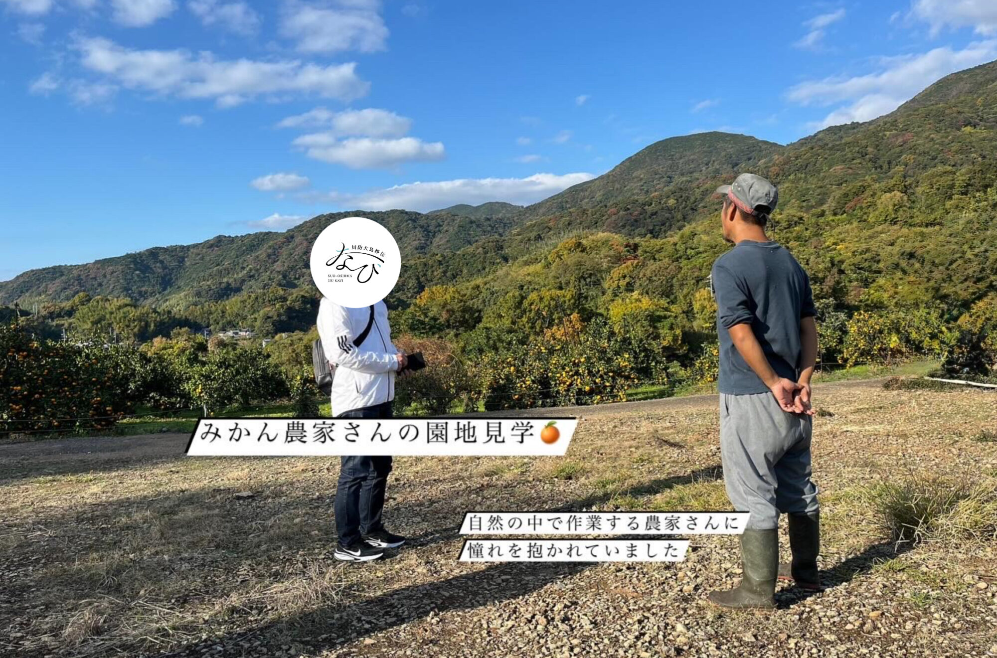 実際にみかん農家をされている方の園地を見学させていただき、みかん農家の作業や暮らしぶりについてお話を伺いました。聞き慣れない1町や1反という畑の広さを実際の目で見て、作業の大変さを実感したそうです。